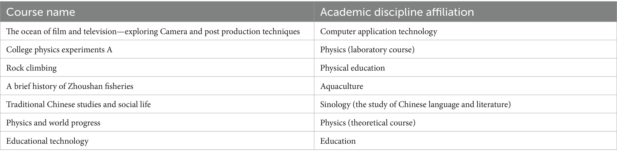 The academic classification of these 7 courses was shown in the Table 2 below. The students’ academic backgrounds came from all majors at Zhejiang Ocean University, with no specific focus on a particular major.