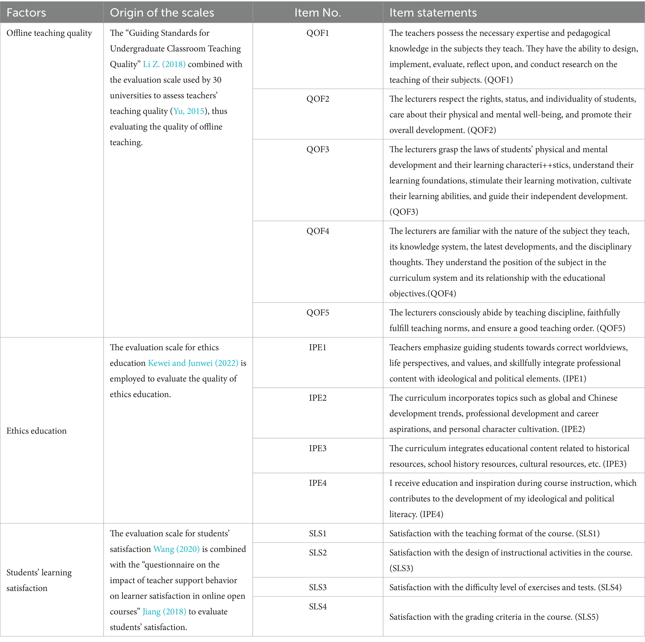 Since the school-wide academic evaluation primarily focused on three crucial aspects: the quality of teachers’ offline teaching, ethics education, and students’ learning satisfaction. This selective emphasis took into account the diversity of disciplines and other pertinent considerations. Hence, the study specifically concentrated on comparing the differences in these three factors. By utilizing rigorous statistical analysis, the study was expected to provide valuable insights and recommendations for further enhancing the academic evaluation system within the school. The evaluation scale for these three factors was shown in the Table 3 below. The scales adopted in this study are classic instruments that have been repeatedly utilized and validated in Chinese pedagogical research.