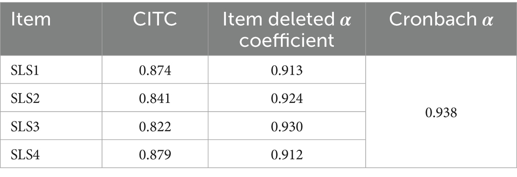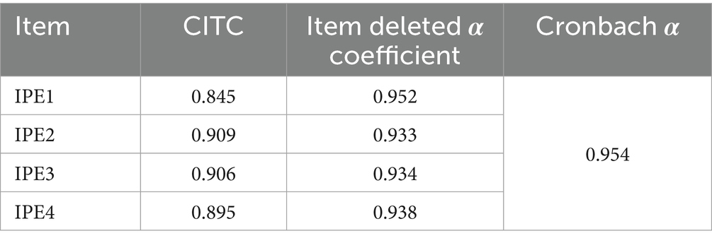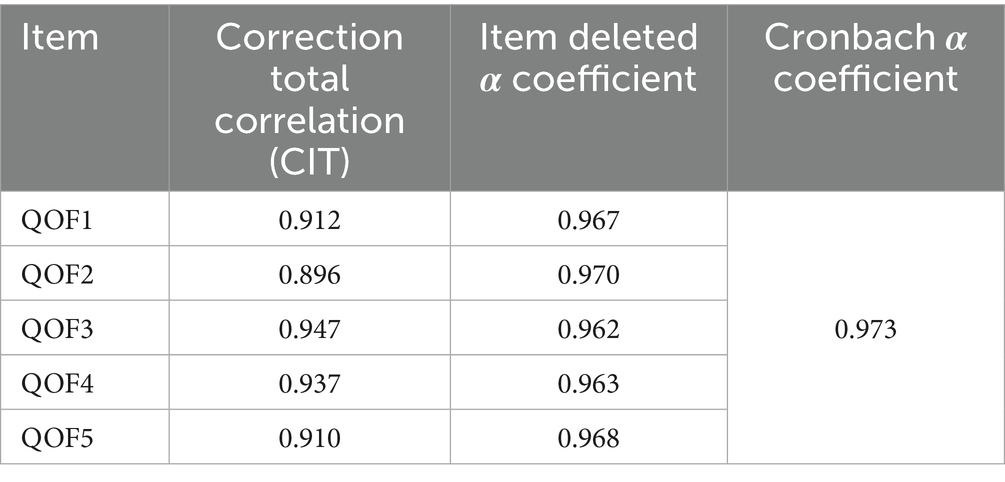 The Cronbach’s coefficients for QOF, IPE, and SLS are 0.973, 0.954, and 0.938, respectively. This demonstrates that the scale data are highly reliable and suitable for research analysis. For detailed data, please refer to Tables 4–6 below.