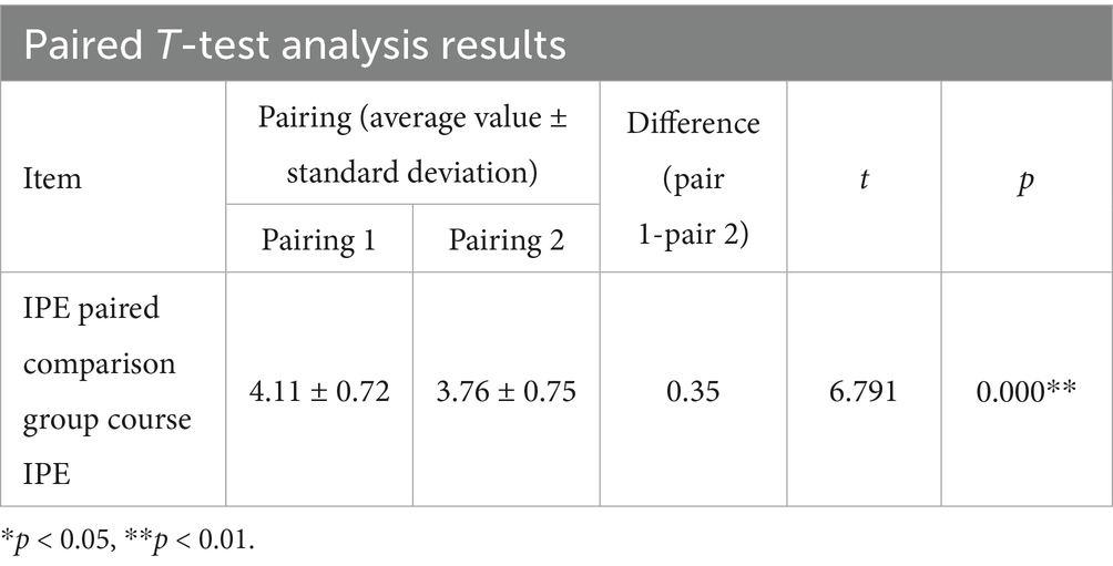 There was a significant difference at the 0.01 level between IPE and the comparison group’s course IPE. The t-value was 6.791 (p = 0.000). Specifically, the average value of IPE (4.11) in the blended learning group was significantly higher than the average value of the IPE in the comparison group (3.76).