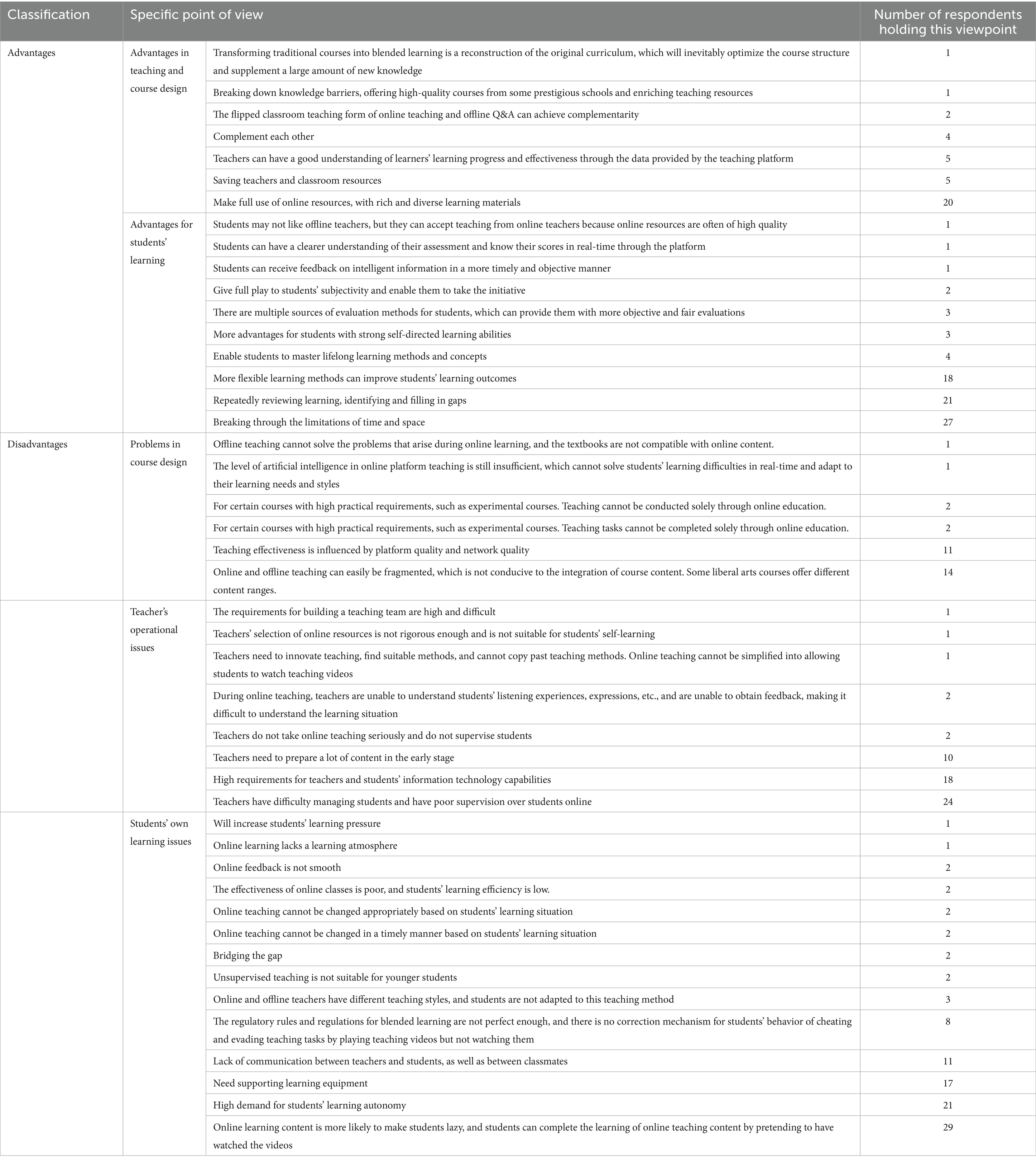 As no dissenting opinions emerged, this study proceeded to design a question to inquire about the advantages and disadvantages of blended learning. The specific question was: “What are the advantages and disadvantages of blended learning?” Some specific cases were as follows: