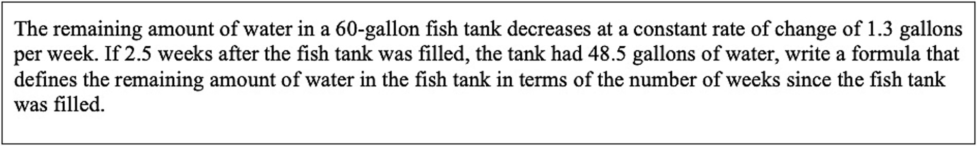 When the interviewer probed Daniel’s meaning for CROC in the context of the fish tank problem (see Figure 2), he responded by providing a precise description of the two covarying quantities to be related. He responded by saying, “our relevant quantities in this situation are the number of gallons in the fish tank and the number of weeks since it was filled.”