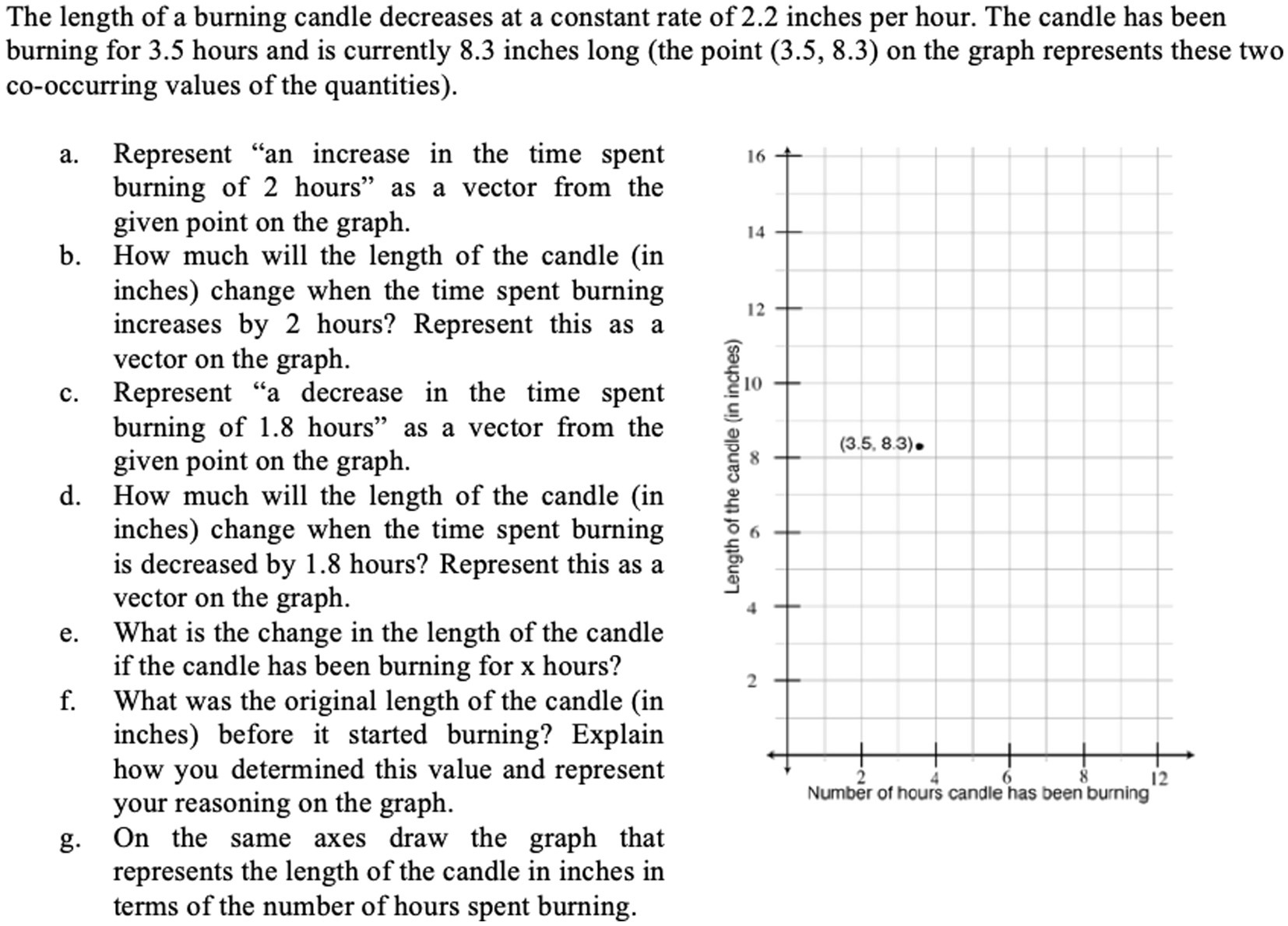 Daniel: So in the first one they want us to represent an increase in the time spent burning two hours as a vector from the given point on the graph. So what that is really saying is that I know what this point [he is showing the point (3.5, 8.3) given on the graph]. We moved the time forward two hours, ignoring the height of the candle. So let us say the candle stopped burning and the time increased by two hours. What would happen to this point? Someone comes up with a drawing for me.