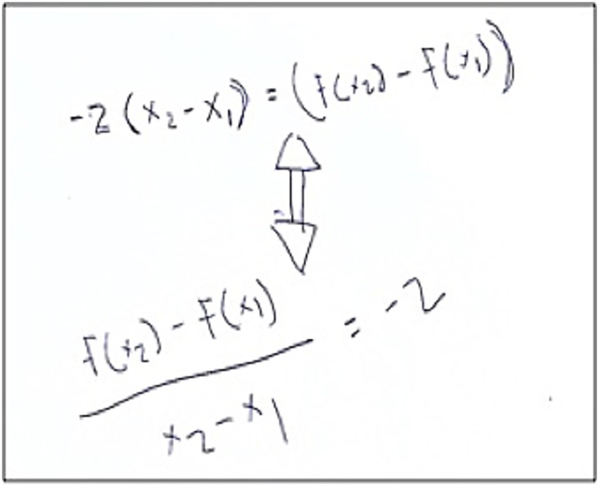 Daniel: For me, a better notation for, let us say we had a constant rate of change of , and let us say instead of a constant rate of change relationship, we have a function relationship that has a CROC of , by definition what that would mean is that [he is writing down ], so this is how we would write down an arbitrary change in input, and then your function notation gives you, “okay, what is the corresponding change in the output.” Okay, well, function notation gives you notation for that for free. It’s built like that; it’s this (he is writing down ). And at least to me, that is so much clearer that this is the change that specifically corresponds with the change in the input. Because you plug it in, right? This is imprecise (he is pointing at ) and this is better (he is pointing at ).