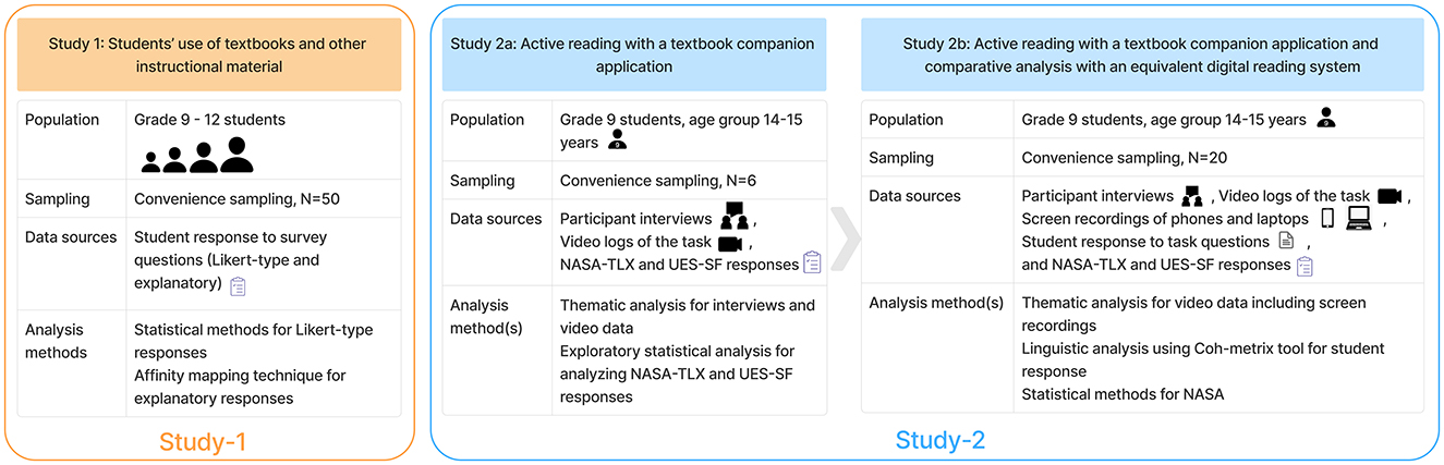 Comparison chart detailing three studies on student reading habits and tools. Study 1 involves grade 9-12 students with a sample size of 50, using Likert-type surveys and affinity mapping. Study 2a, with 6 students aged 14-15, employs thematic and exploratory statistical analyses of interviews and task responses. Study 2b, including 20 students with similar age and demographics, adds video logs, screen recordings, and statistical methods for analysis, comparing a textbook companion app with a digital reading system.
