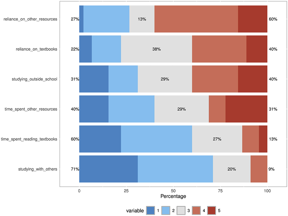 Stacked bar chart showing percentage reliance on various study resources. Categories include reliance on other resources, textbooks, studying outside school, time spent on other resources, reading textbooks, and studying with others. Each category is divided into five levels, with darker shades representing higher levels of reliance. The highest percentages are seen in lower reliance levels, except for reliance on other resources and time spent reading textbooks, which are higher at level 5 and level 1 respectively.
