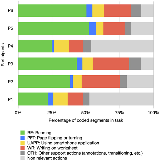 Bar chart showing the percentage of coded segments in tasks for six participants (P1 to P6). Categories include Reading (green), Page flipping or turning (yellow), Using smartphone application (blue), Writing on worksheet (red), Other support actions (orange), and Non-relevant actions (gray). Each participant has a unique distribution of these activities, with Reading consistently being the largest segment.