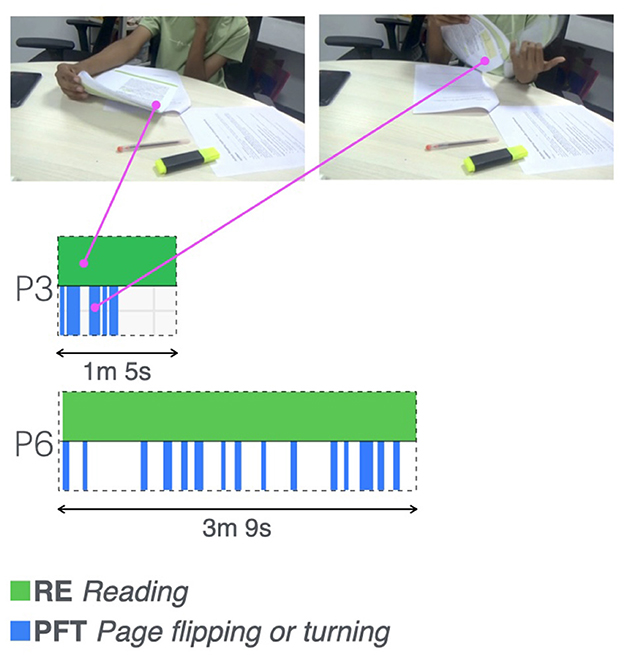 Examining the coded segments for the participants (see Figure 3) we see that the participants were involved in reading from the textbook for a significant portion of time while doing the task. Additionally, the duration for each of these interactions was in line with the results of Hong et al.'s findings (Hong et al., 2012) where a similar method was used for the analysis of reading behavior from the sequential analysis of video data. In the data, the reading process is accompanied by the actions of page flipping and turning, which is indicated by overlapping segments with codes RE and PFT. Other behaviors of information extraction from the text can be interpreted from the data, such as skimming and scanning by the learner, which in the data can be seen when short reading duration overlaps with multiple frequent page flipping segments as shown in Figure 4.