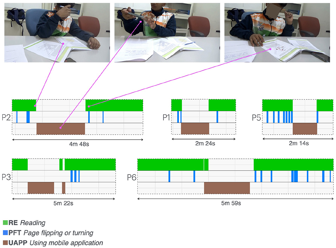 Figure 5. Timelines showing the app usage activity segment in between continuous reading activity segments during the task for participants P2, P1, P5, P3, and P6, with cropped snapshots from the video data (of participant P2).