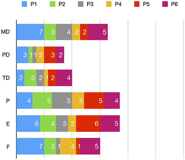 Bar chart displaying six horizontal categories labeled MD, PD, TD, P, E, and F, with segmented bars representing six variables: P1 to P6, each in distinct colors. The segments vary in size and include numerical values ranging from one to seven, reflecting variable proportions within each category.