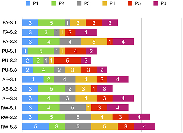 Bar chart showing multiple horizontal bars labeled from FA-S.1 to RW-S.3. Each bar is divided into segments colored light blue (P1), green (P2), gray (P3), orange (P4), red (P5), and purple (P6), representing different categories. The numbers within the segments range from 1 to 5. Each bar displays a varying combination of these colors and numbers, indicating categorical differences across twenty bars.