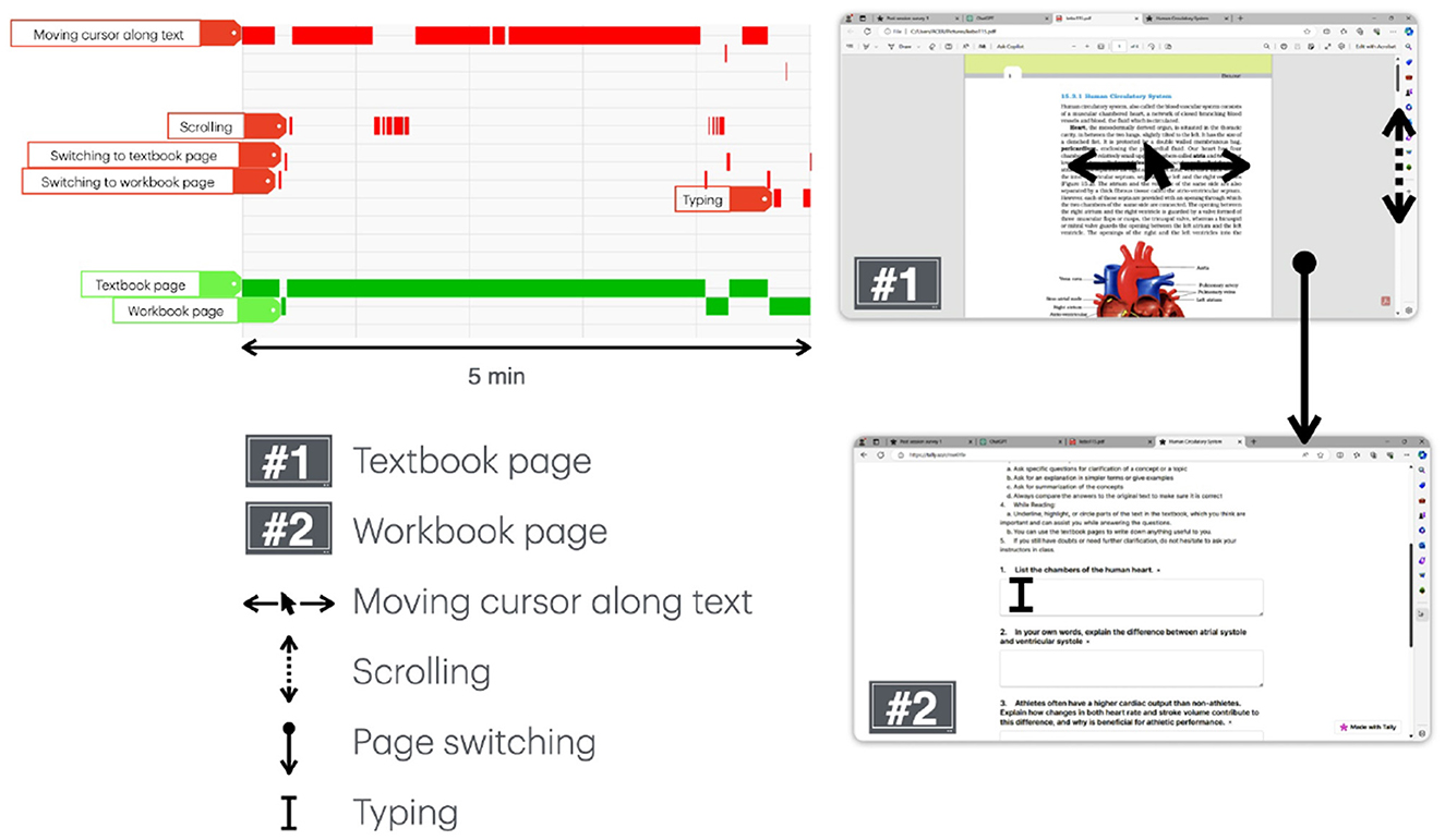 Timeline of activities over five minutes showing interactions with textbook and workbook pages. Includes actions like cursor movement, scrolling, page switching, and typing. Two screenshots display a textbook page with diagrams and a workbook page with questions.