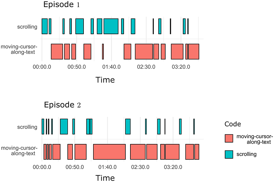 Figure 9. Temporal sequences (two episodes) of digital reading processes with the actions scrolling and visual tracking (moving cursor along the text, as mentioned in code-book given in Table 3).