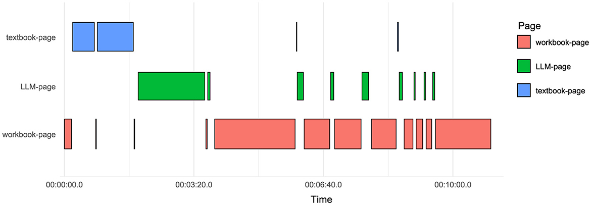 Writing answers involved multiple switching instances between workbook, textbook, and LLM pages. In most cases when the learner was not able to locate the answers easily upon reading textbook they switched to LLMs, moreover, there were instances where they formulated the answers with the help of LLMs. The visualization for the temporal sequence of the time spent on different pages by a participant is shown in Figure 10. Here, instead of the learner actions, we took the digital artifact with which the learner is interacting while answering a question. In this sequence, we see that the learner starts their interaction with the workbook page to read and understand the question followed by searching into the textbook. Thereafter the learner has switched to the LLM page to search for the answer to the workbook question. They later exclusively refers to LLMs for the remaining duration of their answering task for a question.