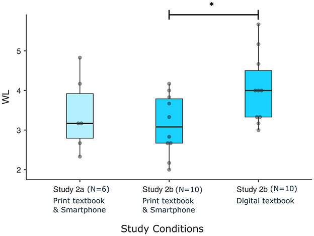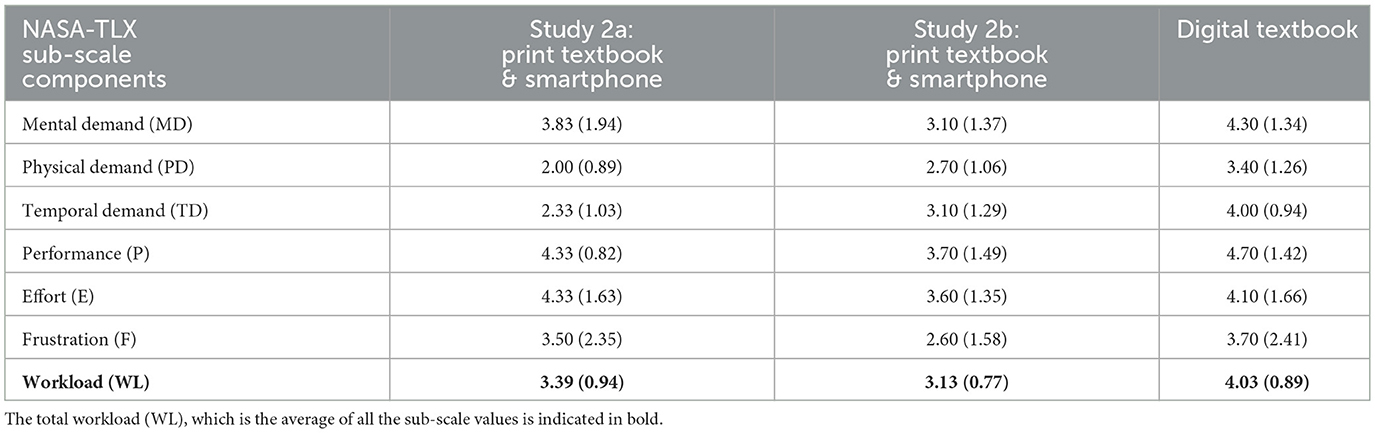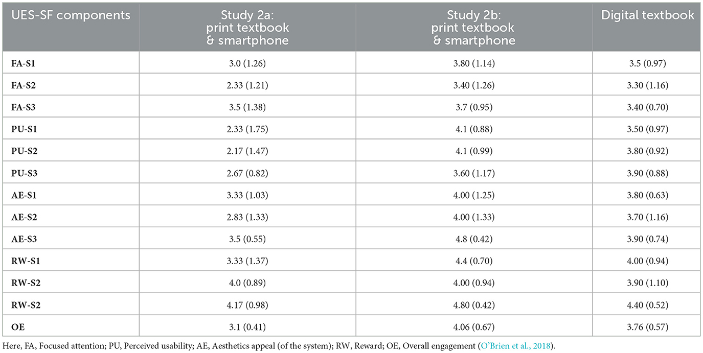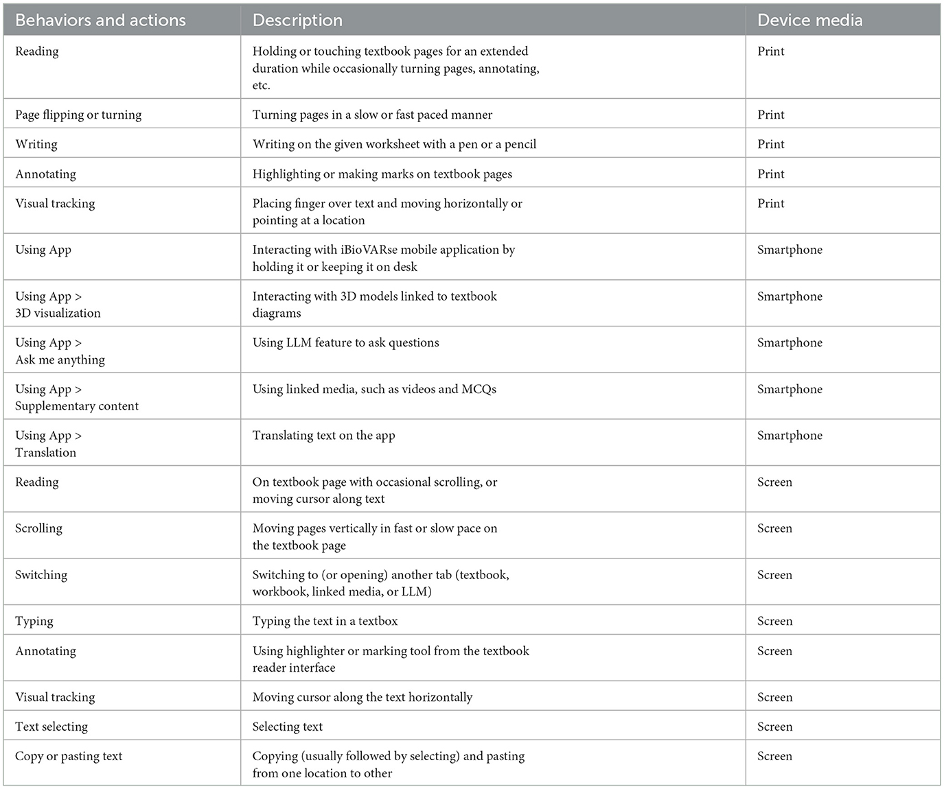 For study 2b, the data analysis approach involved qualitative and quantitative methods for the two participant groups, i.e., printed textbook with a smartphone-based companion application (iBioVARse) vs. an interactive digital textbook. For the qualitative analysis of the reading behavior from the video data, procedure similar to study 2a was adopted. The corresponding codebook for labeling video data was expanded to accommodate screen recordings for smartphones and laptops (see Table 3). Similarly, for the quantitative data obtained from NASA-TLX and UES-SF scales, a statistical test was performed (in Jamovi4: an open statistical tool) to compare the two groups (as used in prior studies for quantitative measures Jian, 2022; Schmid et al., 2023; Liu et al., 2024).