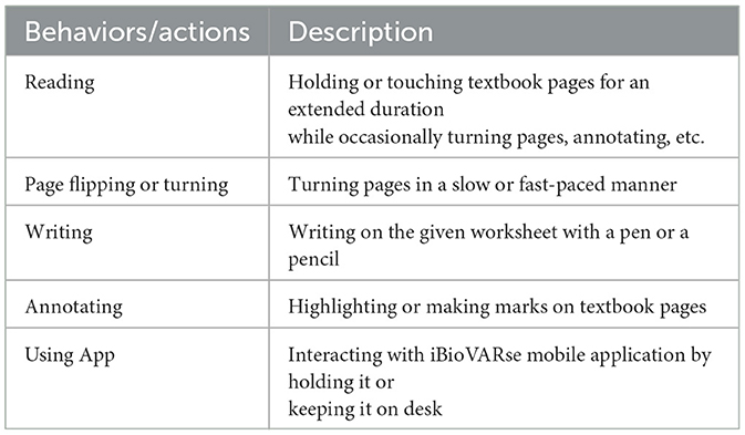 Reading session: As mentioned in the previous sections that the context for this study involved reading a printed textbook with a mobile companion application. Hence, the researcher team chose iBioVARse application (Saindane et al., 2023b) for this study as it was designed to be used as a companion application for the NCERT textbooks and has significantly higher usability than DIKSHA (see text footnote 2), which is widely used in the school ecosystem. Students were given a topic from the NCERT Biology textbook (can be accessed through this URL: https://ncert.nic.in/textbook.php?kebo1=15-19) to read and answer five related questions on a worksheet (the evaluation questions are provided in the Appendix). Additionally, researchers ensured that the students are able to use the application by demonstrating various use cases and allowing them to interact with it before the task, and the task data was collected using a video-camera by the researchers. The task duration for the participants was approximately 40 minutes, which was consistent with the study durations mentioned in the previous literature on reading behavior analysis (Hong et al., 2012), and quasi-experimental studies with school students (Liu et al., 2024; Casteleiro-Pitrez, 2021).