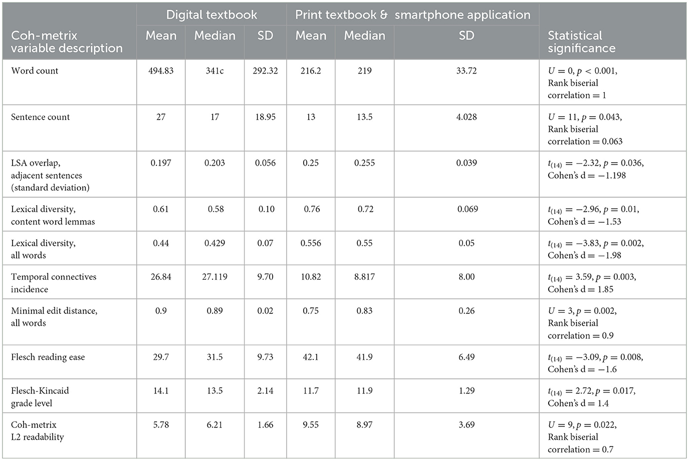 The student textual responses to questions were analyzed using the Coh-metrix indices that computes indices ranging from basic text properties to lexical, syntactic, and cohesive measures (McNamara et al., 2014). For the current analysis Coh-metrix 3.0 was selected as it provides us with a set of 108 indices for assessing lower level (word count, paragraph count, etc.) and higher level (e.g. cohesive measures) aspects of the text. Prior studies have used these indices in multiple ways for the analysis, such as, using a subset of the indices for looking into a singular aspect of the text (like readability) (Feller et al., 2024), alongside a conventional rubric for evaluating (Mahadini et al., 2021), and in predictive modeling (Zagata et al., 2023). Hence, after computing the indices for all the valid student responses, statistical tests for comparison between two groups were performed on the indices that are reported (in prior literature) to be related to the reading comprehension skill (Allen et al., 2015). In this analysis we wanted to have a broad-based comparison across all aspects of the text, rather than focusing on an individual aspect [for example, only analyzing cohesion using "Tool for the Automatic Analysis of Cohesion” (TAACO) (Crossley et al., 2016)].