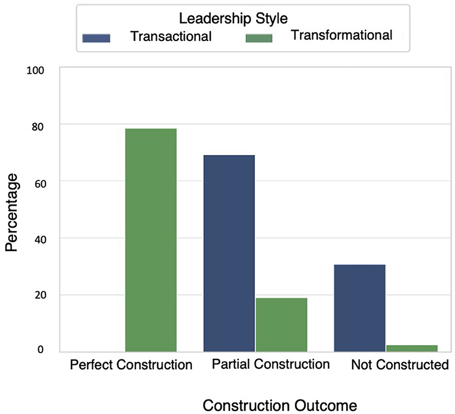 In contrast, in the transactional leadership condition, no team achieved a perfect construction. The majority (69.2%) completed a partial construction, while 30.8% were unable to build the figure.