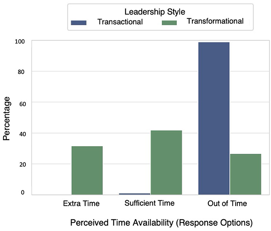 Figure 2 shows the differences in perceived time availability during the task according to leadership style. In the transactional leadership condition, the vast majority of groups (98.9%) reported that they ran out of time to complete the task, only 1.1% indicated that the time was sufficient, and no group reported having extra time.