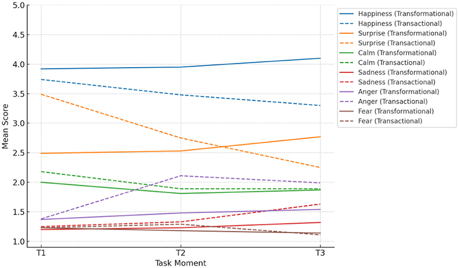 Figure 3. Evolution of emotional climate change during the task by leadership style. Scores are based on a 1–5 scale (1 = not at all, 5 = very much).