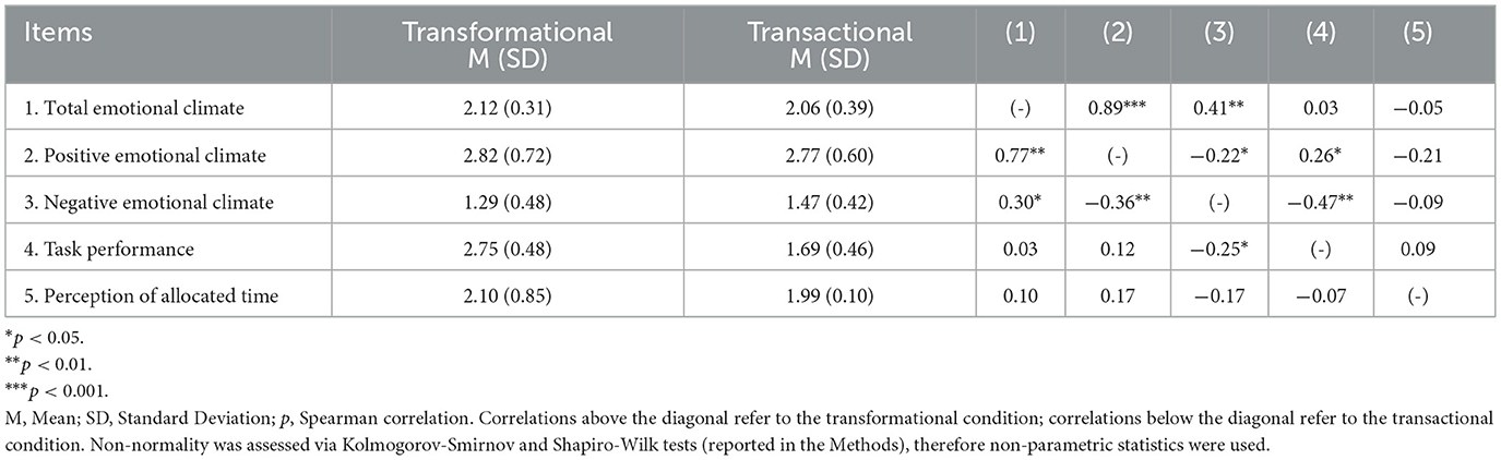 Before conducting inferential analyses, the assumption of normality was assessed for the study's main variables (i.e., emotional climate, performance, and time perception) using the Kolmogorov-Smirnov and Shapiro-Wilk tests. In all cases, the results indicated significant deviations from normal distribution (p < 0.05), thereby justifying the use of non-parametric tests in subsequent analyses. Descriptive statistics (i.e., means and standard deviations) and Spearman correlations for each variable are presented in Table 1. Correlations above the diagonal correspond to the transformational leadership condition, and those below the diagonal correspond to the transactional leadership condition.