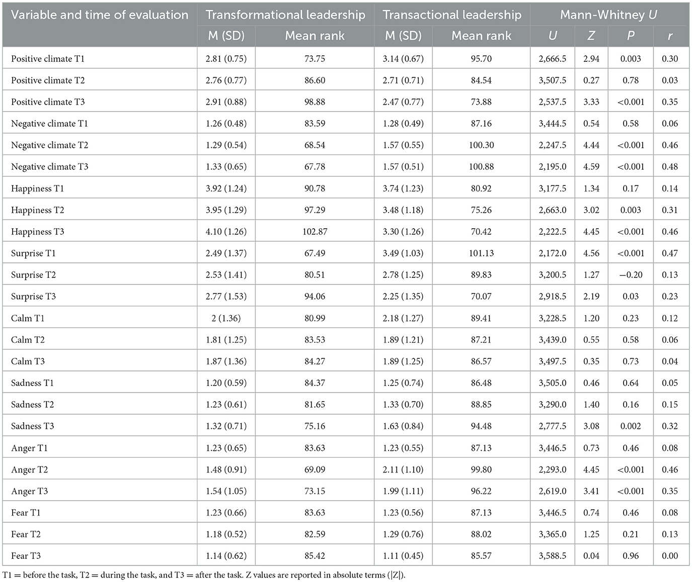 Table 2. Differences in emotional climate between leadership styles by time of evaluation (Mann–Whitney U; N = 93).