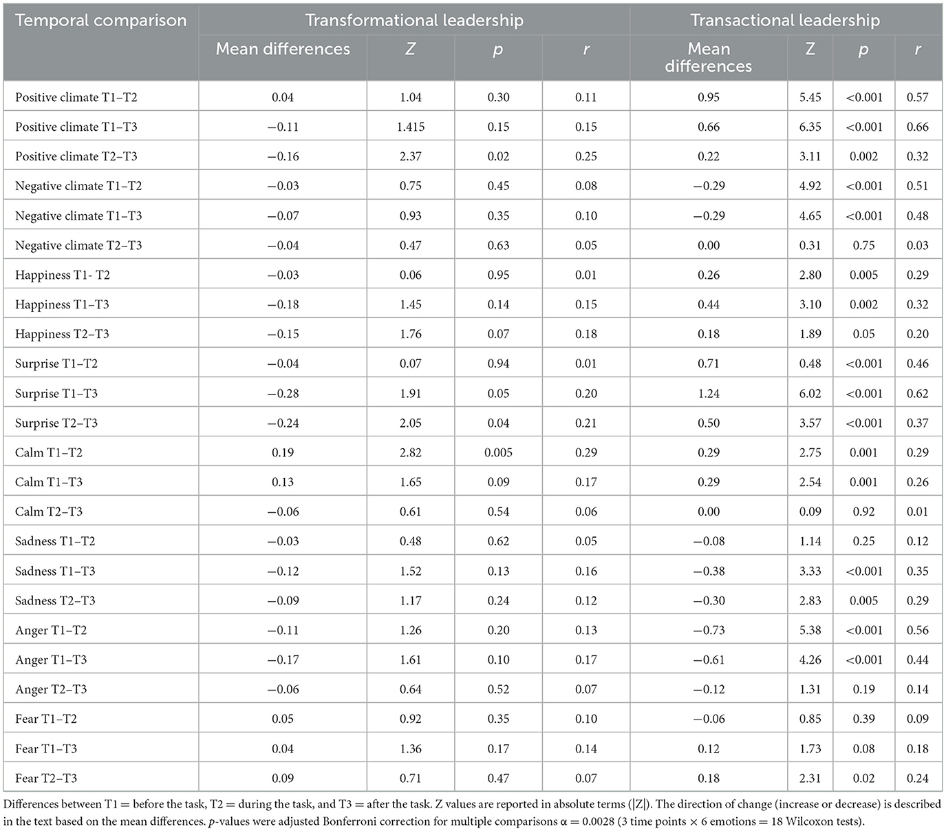 In order to examine the evolution of the emotional climate based on the type of leadership (within-group analysis), non-parametric Wilcoxon tests were applied to compare the three time points of the LEGO task assessment (T1 = beginning, T2 = during, T3 = end) within each experimental condition (transformational leadership and transactional leadership). The corresponding results are presented in Table 3.