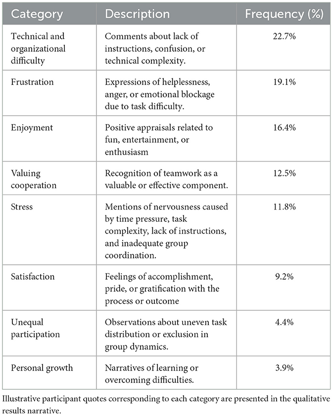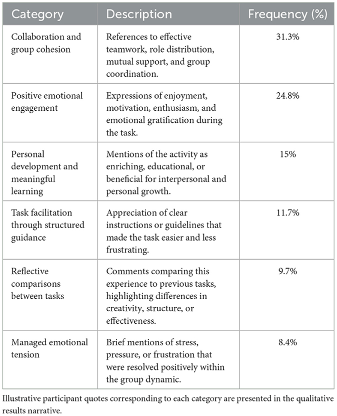 Finally, a qualitative content analysis was performed on the open-ended responses regarding the participants' experience with the task. An inductive open coding procedure was carried out with the support of ATLAS.ti (version 25), which facilitated the systematic organization, segmentation, and management of the data. Two researchers coded the data independently, allowing the assessment of intersubjective consistency. Intercoder reliability was calculated using Cohen's κ, which indicated substantial agreement (κ = 0.82). Discrepancies were resolved through discussion and consensus. Preliminary codes were subsequently refined and grouped into broader categories through a process of constant comparison, which were considered final once conceptual saturation was reached. Finally, the frequencies of the categories were calculated to estimate their relative weight and provide a quantitative complement to the qualitative analysis.