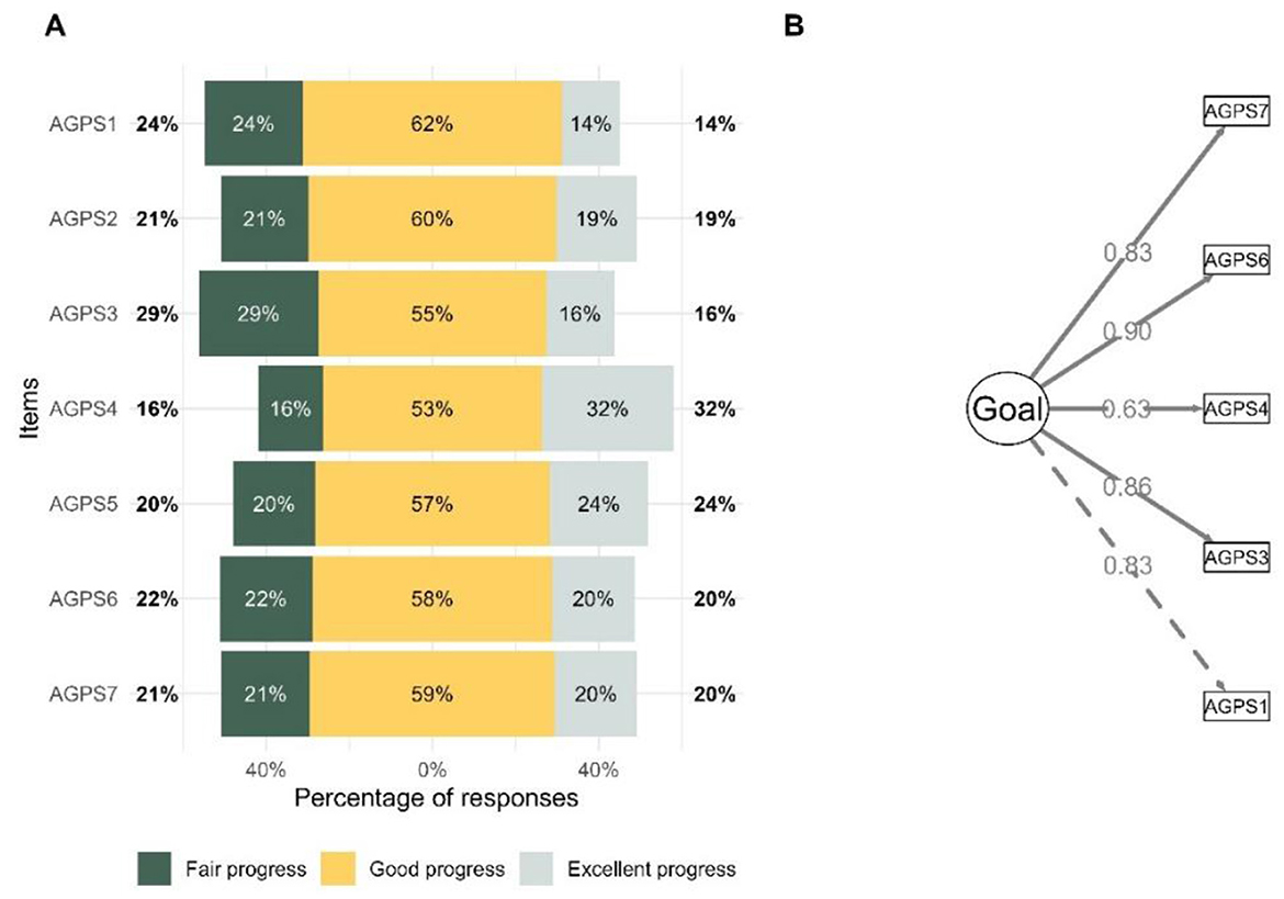 Figure 1. Descriptive analysis of the items and structure factorial of AGPS. (A) Item response rates. (B) Test factor structure.