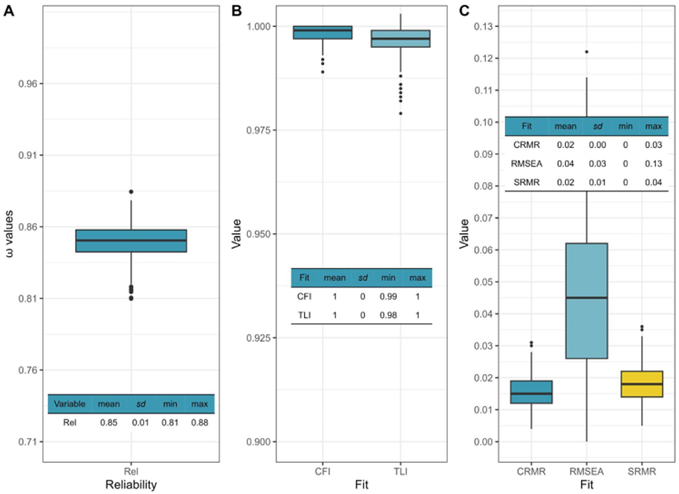 Figure 2. Stability of the factorial model. (A) Replication of the reliability. (B) Replication of comparative goodness-of-fit indices. (C) Replication of absolute goodness-of-fit indices.