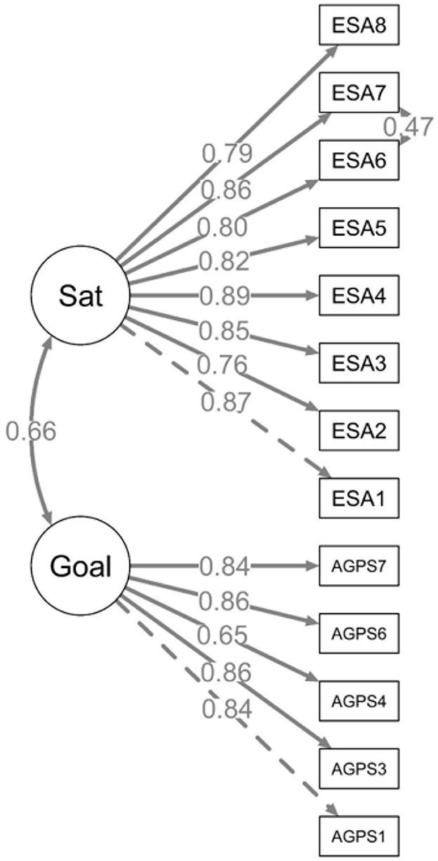 On the other hand, concurrent validity, evaluated by means of structural equation modeling, confirmed a strong association between academic progress goals and academic satisfaction. This finding supports the proposal of (Lent et al., 2007) and agrees with previous studies in students and teachers (Hui et al., 2013; Lent et al., 2011), evidencing that goal attainment promotes the satisfaction of psychological needs and general subjective wellbeing (Diener, 1984; Klug and Maier, 2015).