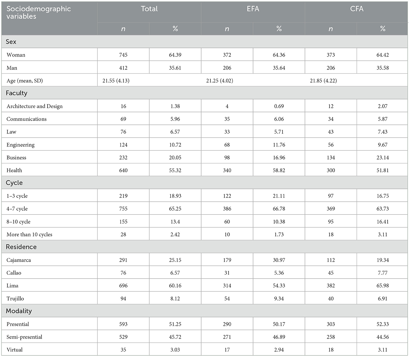 An a priori power analysis using semPower (Moshagen and Bader, 2023) with df = 14, RMSEA = 0.05, power = 0.95 and α = 0.05 indicated a minimum of 778 observations. Our sample of 1,157 undergraduates exceeds this requirement. Table 1 summarizes their sociodemographic characteristics for the Total, EFA and CFA subsamples, see the table for full details.