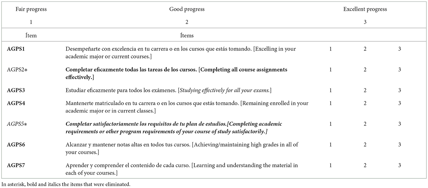 Conclusion: The five-item AGPS is a brief, reliable, and valid tool for measuring academic goal progress among Peruvian university students. Its strong psychometric properties and cultural adaptation make it suitable for research, educational policy design, and interventions aimed at enhancing academic engagement and reducing dropout rates.
