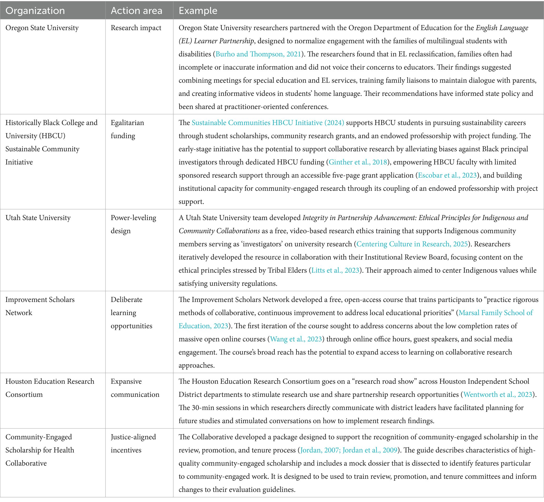 Though these theoretical perspectives provide a vital orientation, we argue that they must be tied to concrete, actionable mechanisms for institutional change. Grounded in our literature review and insights from CERC, we identify six areas that promote the enactment of our orienting commitments: research impact, egalitarian funding, power-leveling design, deliberate learning opportunities, expansive communication, and justice-aligned incentives. Recognizing the disproportionate influence research-side actors have in shaping the research process, we focus on their roles and responsibilities while also underscoring the importance of future work that addresses the contributions and needs of practice-side and community partners.1