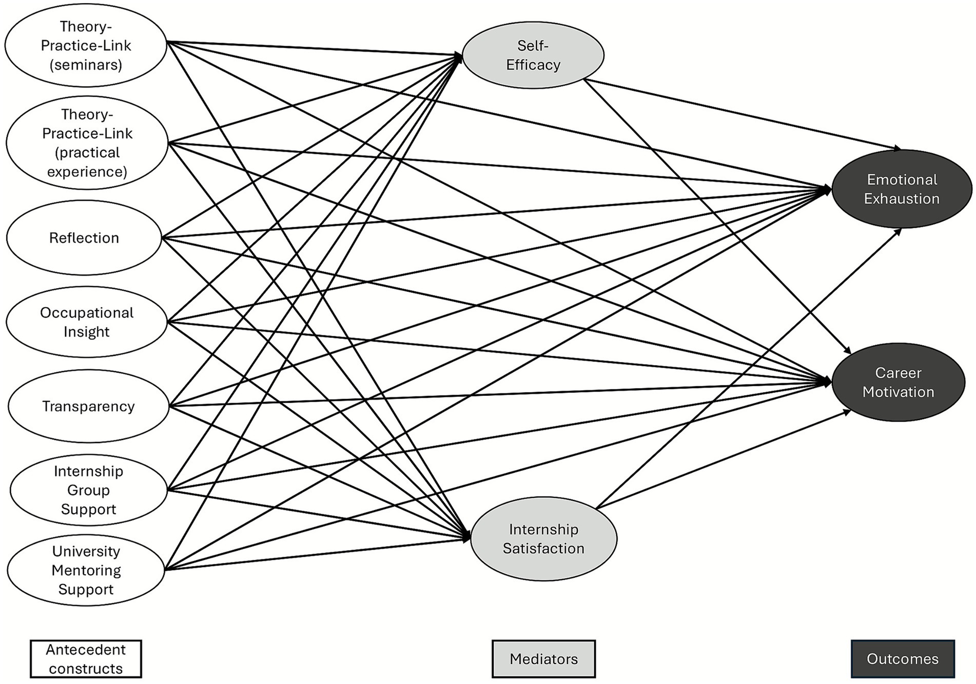 The evaluation survey included: perceived theory–practice link (in both the accompanying university seminars and the general practical experience), occupational insight, reflection on the practical experience, university mentoring support, internship group support, perceived transparency, self-efficacy (measured using the ASKU; Beierlein et al., 2013), internship satisfaction, emotional exhaustion (assessed via the German student version of the MBI; Wörfel et al., 2015), and career motivation. The Supplementary material includes the complete evaluation survey and a table with the model-relevant items.