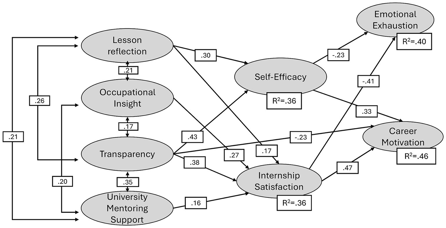 Unexpectedly, “theory-practice link” (in both the accompanying seminars and the school-based internship) and “internship group support” did not prove to be significantly associated with any of the dependent constructs. A complete list of standardized regression coefficients for all tested paths, both statistically significant and non-significant, is provided in Appendix A.2.