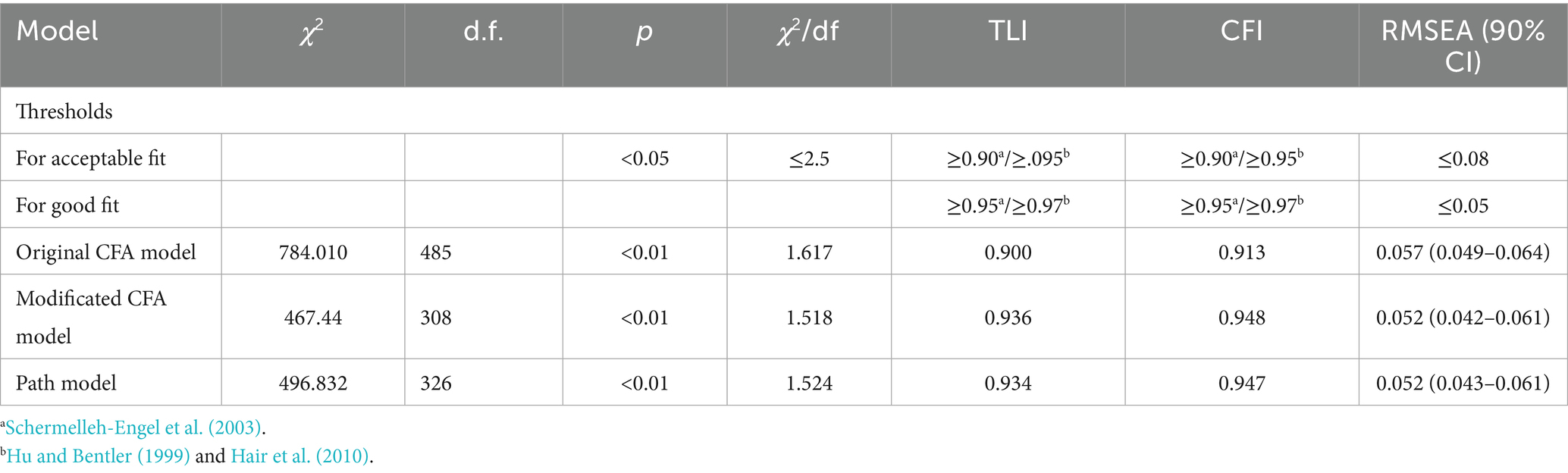 Structural equation modelling (SEM) was performed to estimate the multivariate dependencies of the constructs within the assumed path model. We used maximum likelihood estimation implemented in the AMOS 29.0 software. This procedure assumes multivariate normal distribution of the analyzed variables (skewness ≤ 3; kurtosis ≤ 8; Kline, 2023). The SEM was conducted according to the two-step procedure proposed by Kline (2023). In the first step, a CFA model assuming all constructs to be intercorrelated was estimated. The combined inclusion of these constructs does not represent a single overarching theoretical construct; each scale reflects its respective latent construct. This approach allows examination of the measurement model prior to hypothesis testing. Subsequently, the path model was defined. Global model fit was assessed by different measures (Kline, 2023; Schermelleh-Engel et al., 2003), indicating the fit of the empirical variance–covariance matrix with the data structure implied by the model. Due to its critical dependence on the sample size, the χ2-test is an overly strict measure of global fit (p > 0.05). The assessment of model quality is therefore primarily based on the Root Mean Square Error of Approximation (RMSEA) indicating the proportion of variance–covariance information that is not explained by the model (RMSEA ≤ 0.08: acceptable fit; RMSEA ≤ 0.05: good fit; Schermelleh-Engel et al., 2003) as well as incremental fit measure CFI and TLI, representing the data information that is explained by the model (CFI, TLI > 0.95: acceptable fit: > 0.97: good fit according to Schermelleh-Engel et al. (2003); CFI, TLI > 0.90: acceptable fit: > 0.95: good fit according to Hu and Bentler, 1999; Hair et al., 2010).