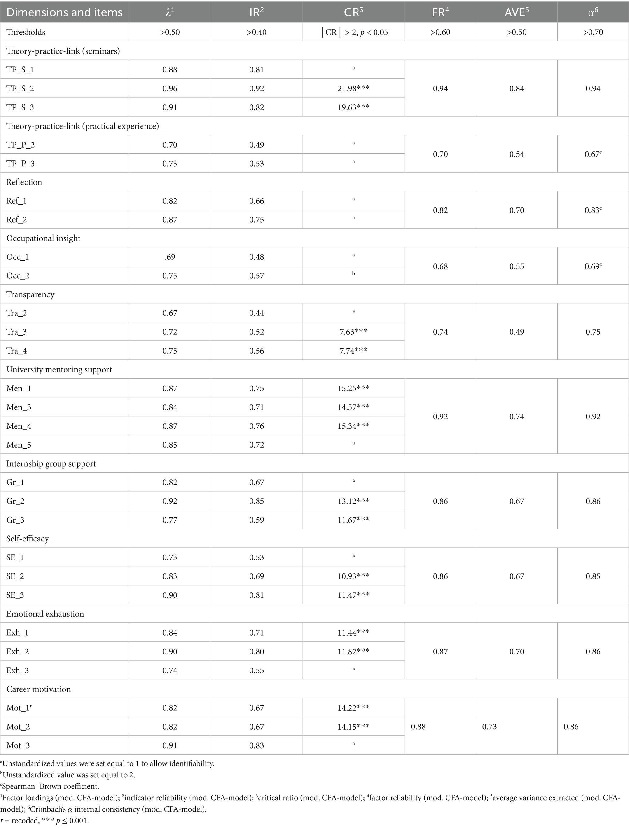 The CFA, assuming each item to be a unique indicator of the assumed underlying constructs—“theory-practice-link,” “reflection,” “occupational insight,” “transparency,” “university mentoring support,” “internship group support,” “self-efficacy,” “emotional exhaustion,” and “career motivation”—already indicates an acceptable global model fit (Table 1, original CFA model; RMSEA = 0.057; CFI = 0.913). However, low factor loadings (λ < 0.50) and low indicator reliability (IR < 0.40) of single items reflect systematic model violations due to insufficient item-construct associations. In order to address these issues, λ and IR values were determined and items with insufficient λ or IR values were removed from the model.