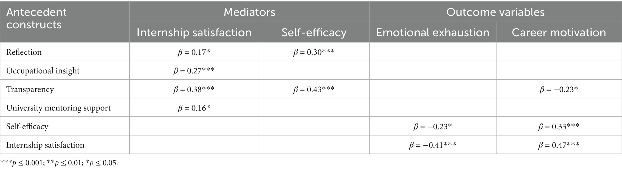 Overall, the model explained 40% of the variance in “emotional exhaustion” and 46% in “career motivation.” Regarding H1, most of the antecedent constructs showed the expected associations with both outcome variables: “Reflection” (β = 0.17), “occupational insight” (β = 0.27), “transparency” (β = 0.38) and “university mentoring support” (β = 0.16) were positively associated with “internship satisfaction” which in turn was negatively related to emotional exhaustion and positively related to career motivation. Furthermore, “reflection” (β = 0.30) and “transparency” (β = 0.43) were positively associated with “self-efficacy” which also was negatively related to “emotional exhaustion” and positively related to “career motivation.” These findings indicate indirect associations between the antecedent constructs and the outcomes through the mediators “self-efficacy” and “internship satisfaction” (H2). As expected, the regression weights of the antecedent constructs on internship satisfaction and self-efficacy were positive (H3), and 36% of the variance in both mediators was explained by the model.