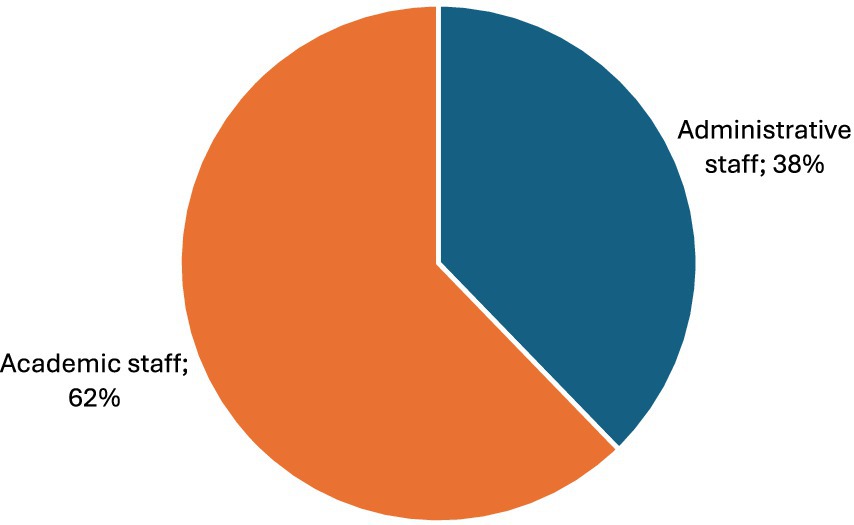 The data implies that 38% of the staff falls under the administrative staff, which typically includes roles responsible for the organization’s day-to-day operations, management, and support functions. On the other hand, the majority, 62%, consists of academic staff, suggesting a significant focus on educational and research-related roles (Figure 2).
