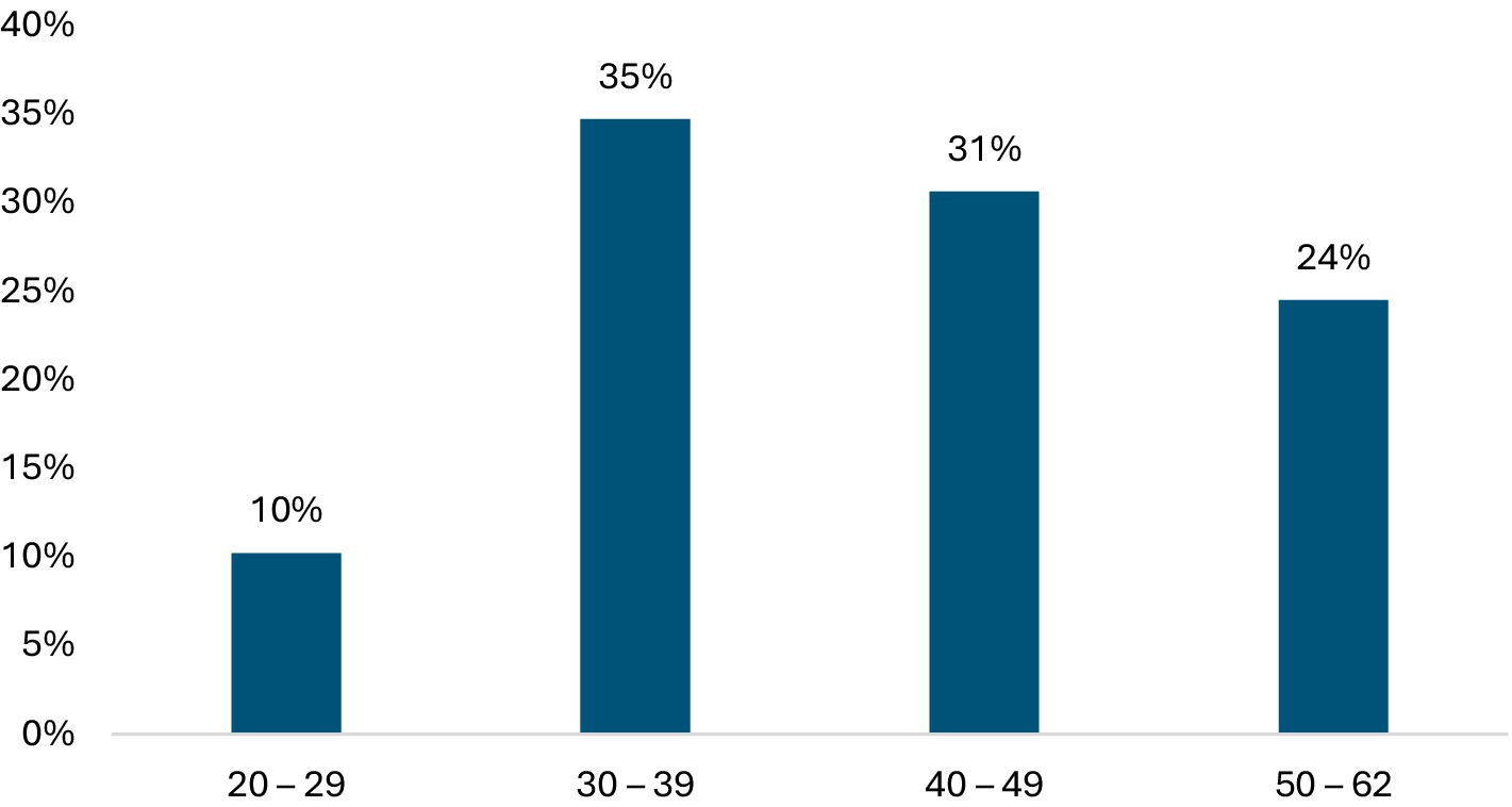 Our sample exhibits a diverse age distribution, capturing a range of perspectives across different life stages. Individuals in the 20–29 age group constitute 10% of our participants, followed by a significant presence in the 30–39 at 35%. The cohort aged 40–49 comprises 31% of our sample, while those between 50 and 62 years old make up the remaining 24% (Figure 4).