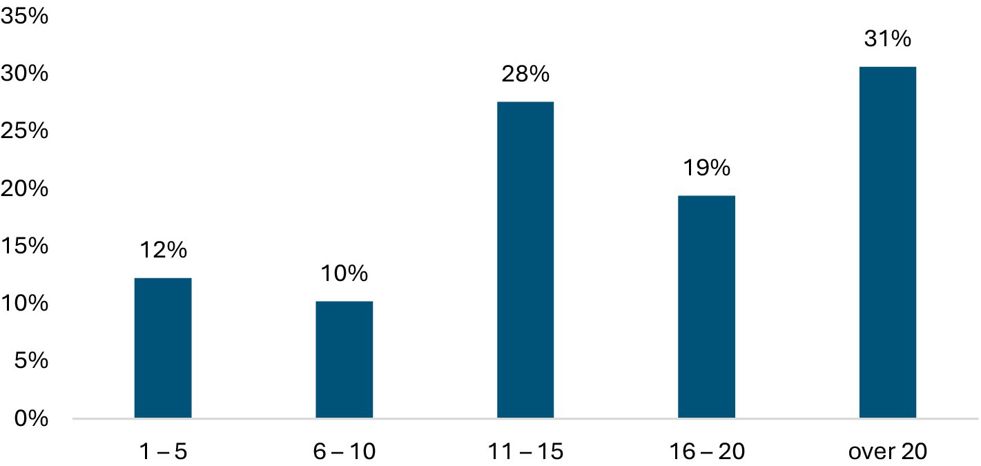 Our sample encompasses a broad spectrum of professional experience, highlighting a wealth of insights from individuals at various career stages. Participants with 1–5 years of experience constitute 12% of our cohort, while those with 6–10 years represent 10%. The majority of our sample falls within the 11–15 years, comprising 28%, followed by a notable presence of individuals with 16–20 years of experience at 19%. Additionally, a group with over 20 years of experience makes up the remaining 31% (Figure 5).