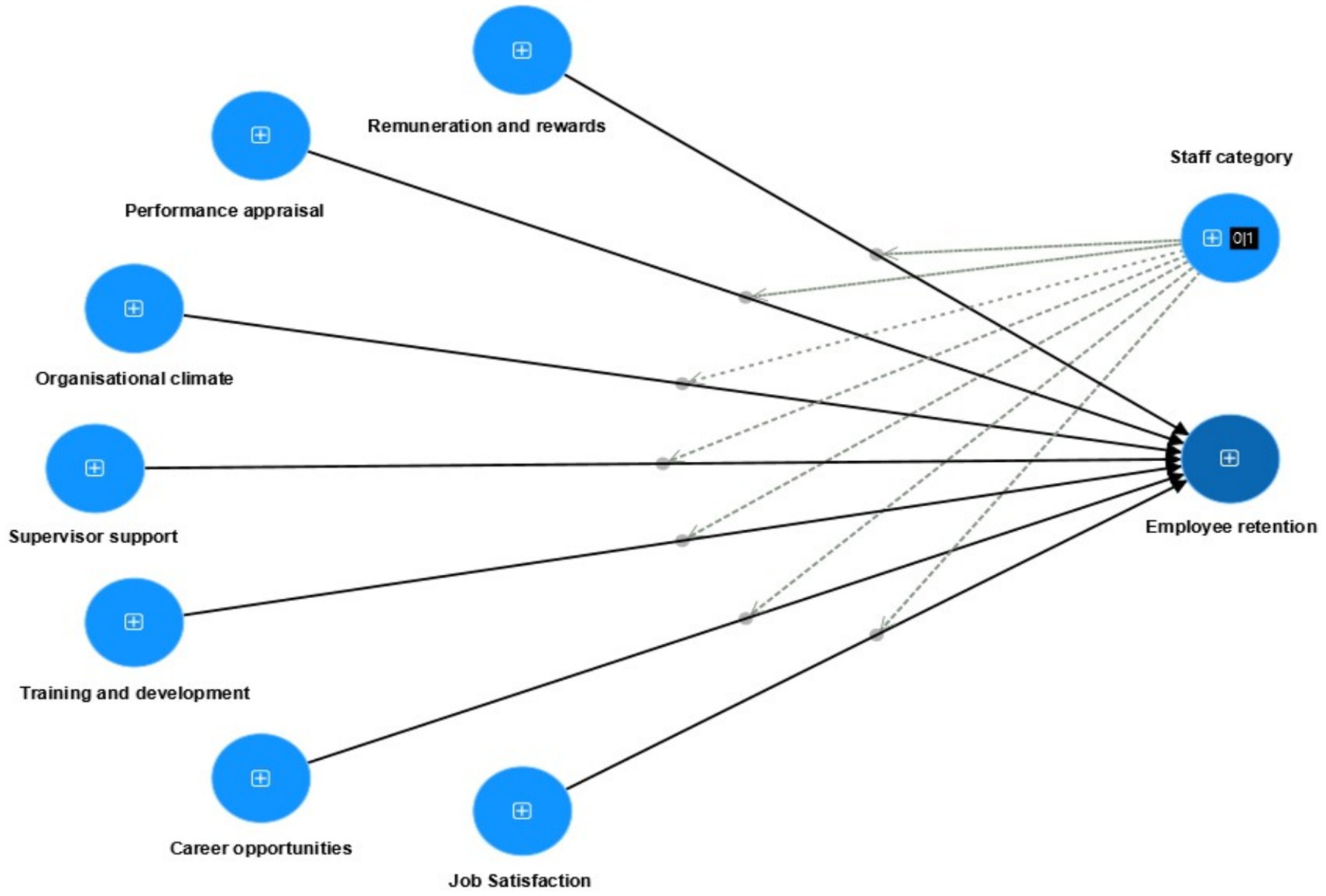 In this study, we will adopt the PLS approach. It is based on the partial least squares method and is less sensitive to sample size and data non-normality. It is implemented using SmartPLS 4.0.9.7 software (Figure 6). All items from different constructs are in the format of a five-point Likert scale. The first three items of the employee retention construct were reversed. Therefore, a recording was performed to ensure that all items in this construct had the same directional relationship with the construct of interest before undertaking statistical analyses.