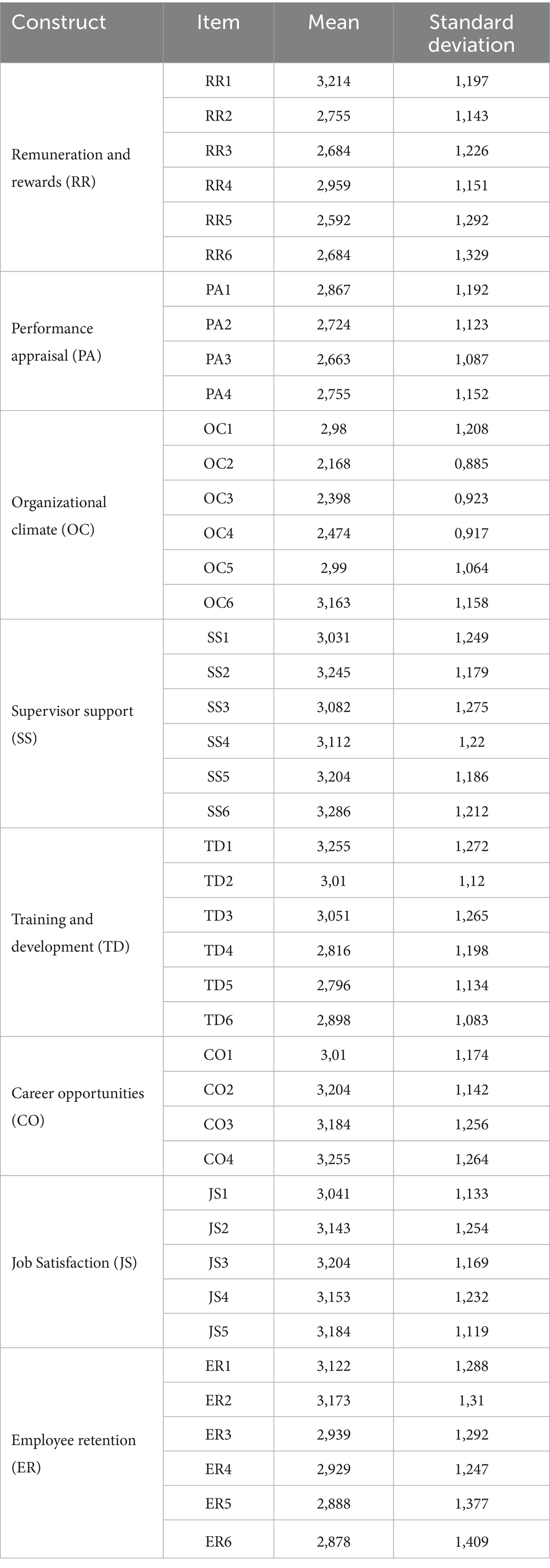 RR1 to RR6 have averages ranging from 2.592 to 3.214. Except for item RR1, the other items have average scores below 3, indicating that overall, employees had a slightly unfavorable perception of compensation and rewards.
