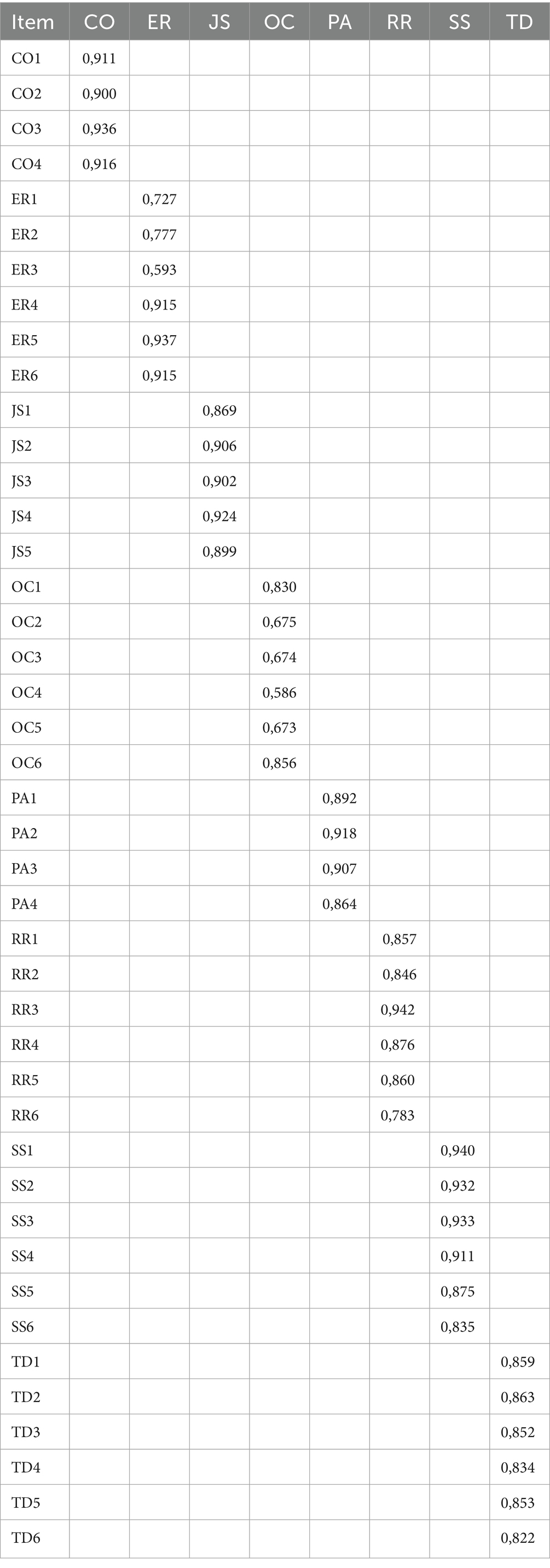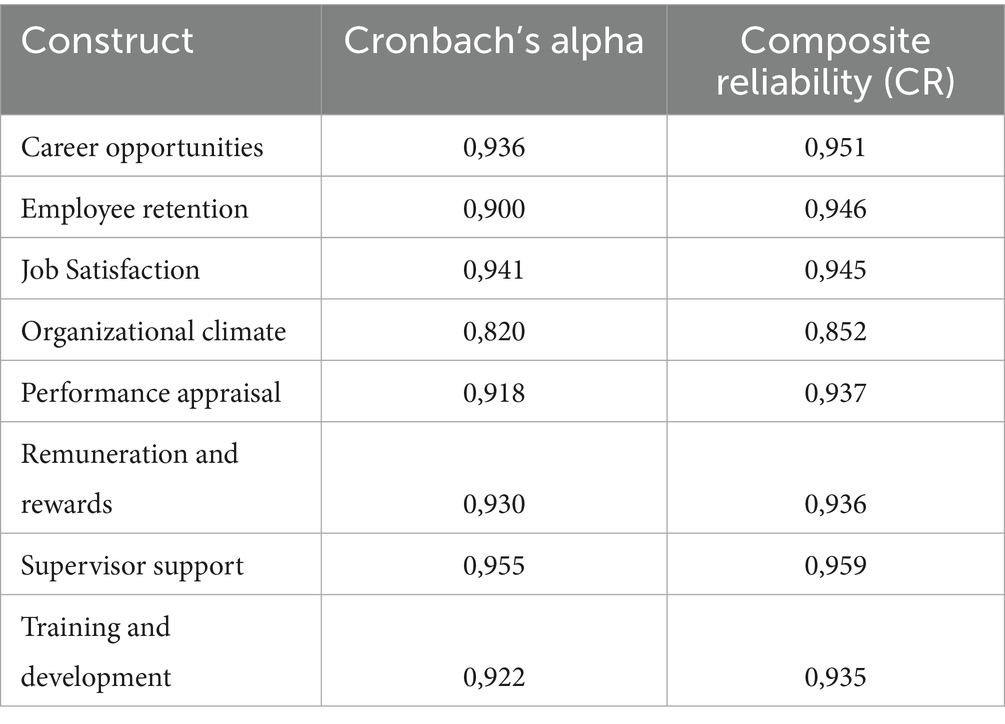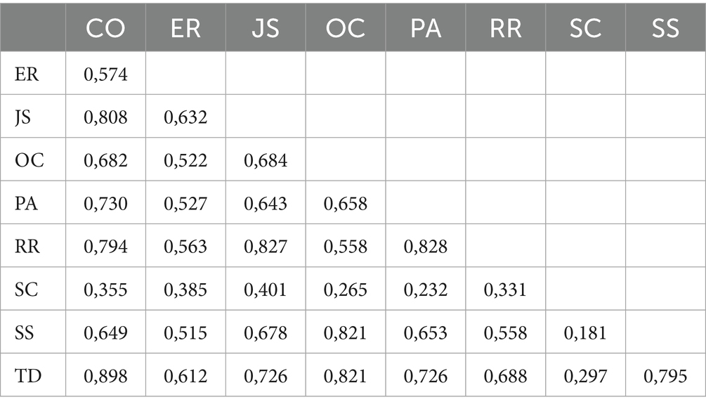 It is interesting to note that the results of the PLS algorithm in this study showed that the values of Cronbach’s Alpha and CR for all latent variables ranged between 0.820 and 0.959 (results presented in Tables 3, 4). Thus, all studied latent variables have reached and exceeded the acceptable reliability threshold of 0.70. The internal consistency of all latent variables is therefore confirmed.