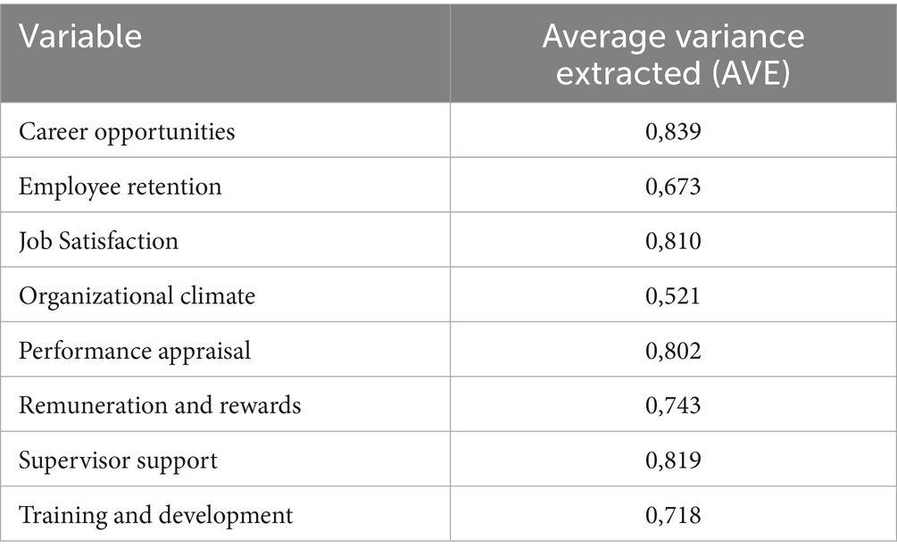 In the context of this study, the AVE values for all constructs ranged between 0.521 and 0.839 as presented in Table 5. Therefore, the study’s AVE results exceeded the recommended threshold value of 0.50, indicating satisfactory convergent validity.