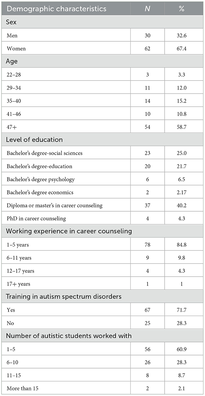 The study included 92 professionals (62 women) who have been working as career counselors in the public or private sector in Athens, Greece. Fifty-one participants (55.4%) had a Bachelor degree in a relevant discipline (education, social sciences, psychology and economics). The rest of the participants (N = 41) (44.5%) had pursued postgraduate studies (either master's or PhD degree) in vocational guidance. Participants were invited to participate in the study by the official Association of Vocational Guidance and Counseling in Greece, which has been established by the Greek Ministry of Education in 2008, or were informed about the research by the social media. All career counselors reported having offered counseling services to autistic students at the time of testing. Participants' demographic characteristics are presented in Table 1.