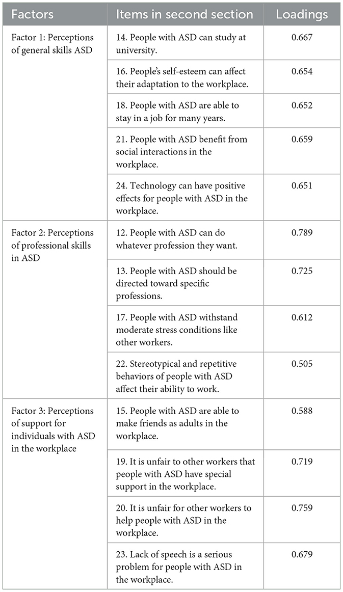 To address the first aim of the study, our first set of analyses has used as input the items of Part B in the questionnaire that explored participants' perceptions of the vocational and interpersonal skills of individuals with ASD. The KMO measure of sampling adequacy of 0.847 and Bartlett's test of sphericity (χ2 = 297.721, p < 0.001) indicated that the exploratory factor analysis was possible. In examining the results of Table 2, the items were clearly grouped under three factors, namely, perceptions of general skills in ASD, perceptions of professional skills in ASD, and perceptions of support for individuals with ASD in the workplace. The three factors accounted for about 48% of the variance.