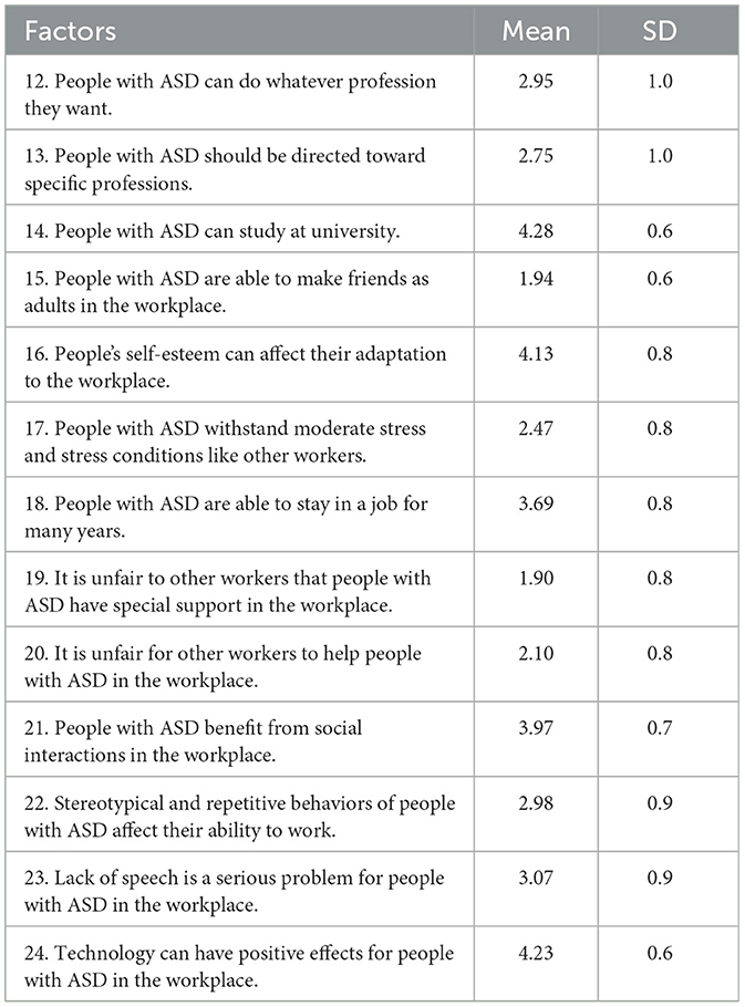 We next provide descriptive statistics summarizing career counselors' response rates based on the answers given in Part B of the questionnaire that focused on their perceptions of the vocational and interpersonal skills of autistic individuals (Table 3). Respondents seemed to agree that people with ASD can study at the university (M = 4.28, SD = 0.6) (item 14), and that technology can have positive effects on people with ASD in the workplace (M = 4.23, SD = 0.6) (item 24). The perception that self-esteem can affect their adjustment in the workplace also had a high agreement rate (Mean = 4.13, SD = 0.8) (item 16). Career counselors expressed low confidence in the notion that providing special support to workers with ASD is unfair to other employees (M = 1.9, SD = 0.8) (item 19) and that people with ASD are able to make friends (M = 1.94, SD = 0.6) (item 15). The perception that it is unfair for other employees to help people with ASD in the workplace had a relatively low agreement rate (M = 2.10, SD = 0.8) (item 20). Career counselors expressed relatively high confidence in the idea that workplace social interactions are beneficial for people with ASD (M = 3.97, SD = 0.9 (item 21).