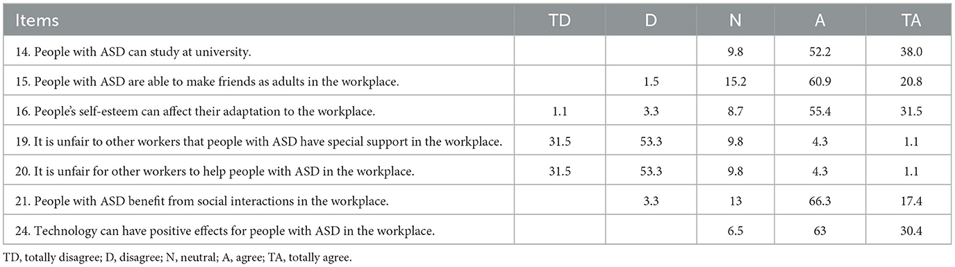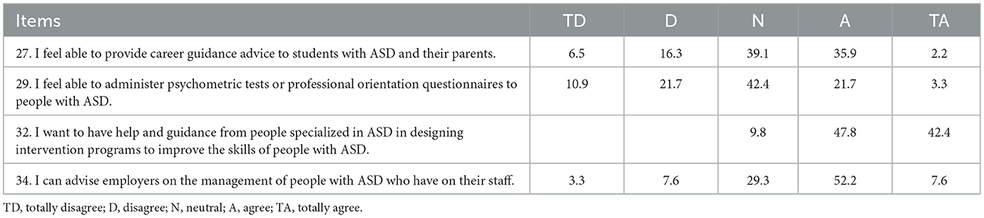 Table 4 below presents response distribution for selected items of Table 3, focusing on the vocational and interpersonal skills of individuals with ASD.